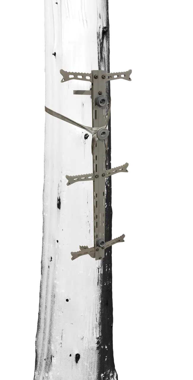 Quite possibly the lightest, most portable climbing sticks on the market! The Helium sticks offer aircraft-grade aluminum construction with weight-saving cutouts making each 30-inch section a scant 2.9 pounds. Dual sided Traction-grabbing steps offer unmatched stability on both sides when ascending or descending. To create a streamlined package for transport the steps fold up and sticks nest tightly together w/ our new silent lock technology suction cups. To add to stealth and ease of setup, a NEW versa button silent strap setup has been added to each stick to limit noise during set-up and TreeDigger™ Teeth bite into bark for added confidence when climbing.